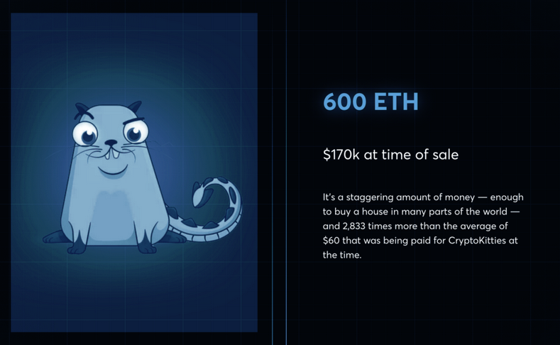 Первые проекты, экспериментирующие с цифровыми активами, в частности NFT, были созданы еще в 2014 году на блокчейне Биткоина в их число входили CounterParty и MasterCoin (ныне OmniLayer). В сети Ethereum уникальные токены появились в 2017-2018 годах и ярким примером их популярности в то время являлась блокчейн-игра CryptoKitties, в которой самым дорогим котиком являлся “Dragon”, проданный за 600 ETH или $175 000 на момент сделки.