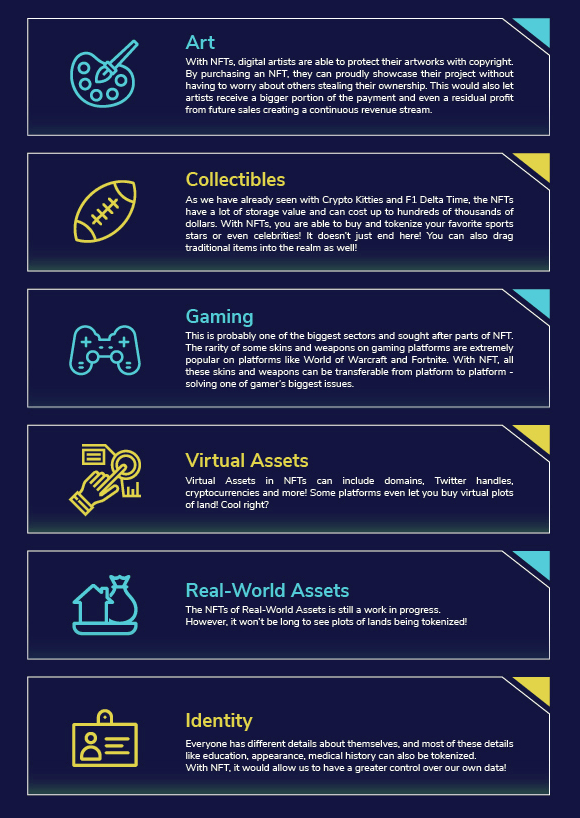 С конца 2020 года популярность NFT стремительно растет, а разработка новых стандартов позволяет использовать их на различных рынках, что в свою очередь предоставляет возможности для дальнейшего развития торговли цифровыми товарами. Технология NFT позволяет оцифровать и перевести ценность вещей и объектов из реального мира в виртуальный. Это расширяет возможности создателей контента и технология находит широкое применение в искусстве, коллекционировании, играх, виртуальных и реальных активах и многих других сферах.