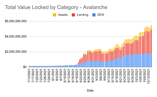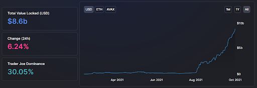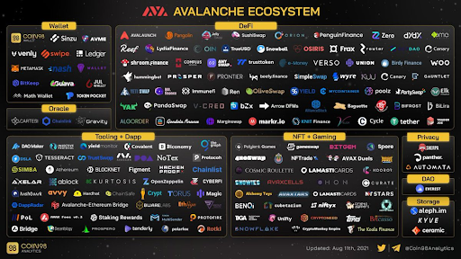 Согласно данным сервиса DefiLama, общее количество заблокированных средств в сети Avalanche составляет около $8.6 миллиардов, что делает ее пятой по объему TVL среди блокчейн-экосистем. Стоит отметить, что стремительный рост популярности сети пришелся на 3 квартал 2021 года, когда токен AVAX вырос на 450%, достигнув отметки в 66$. Рост токена был обусловлен новостями о привлечении средств на сумму 230 миллионов под руководством Polychain Capital и Three Arrows Capital для расширения границ экосистемы.