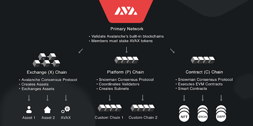 Avalanche является платформой для создания децентрализованных приложений и экосистемой для их взаимодействия. Протокол основывается на алгоритме доказательства доли владения (PoS), а в основу функционирования платформы входят три блокчейна (Subnetworks), которые объединены основной сетью (Primary Network):
