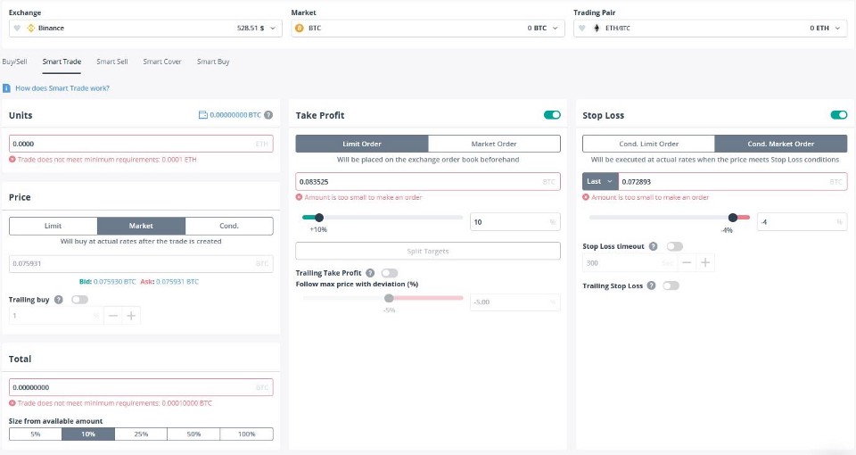 Умный терминал Smart Trade от 3Commas предлагает своим пользователям широкий набор инструментов для эффективной ручной торговли на криптовалютном рынке. Чтобы начать использовать терминал и профессиональные инструменты для торговли, перейдите в раздел “Smart Trade”.