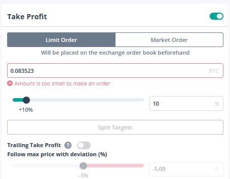 Его можно использовать только на поддерживаемых биржах. При использовании данного инструмента и при достижении целевого уровня прибыли, он начнет отслеживать поведение цены, следуя за ней с указанным отклонением. Активация Tralling Take Profit позволяет максимизировать прибыль в случае дальнейшего движения цены выше заданного уровня прибыли. Более подробную информацию о применении данного инструменте можно найти в данном разделе.