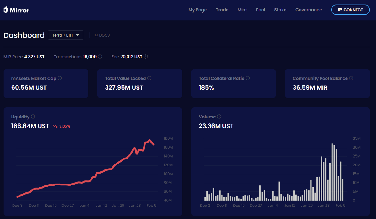 В отличие от Synthetix, где для создания нового актива требуется обеспечение свыше 750%, на платформе Mirror для создания mAsset требуется залог в размере 150% от стоимости торгуемого актива, выплачиваемый в TerraUSD.