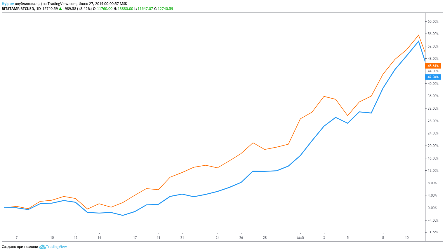 Однако, буквально в одно время с данной новостью курс Bitcoin на Bitfinex стал странно отличаться от курса на других биржах. На графике выше видно, как оранжевая линия Bitfinex превышает рыночную цену (синюю линию). Данное явление как-раз легко объяснить дополнительной эмиссией Tether, которую покупатель просто не успел поглотить.