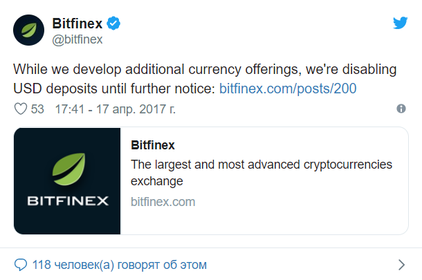 Само собой, биржа делала вид, будто сам банк без объяснения причин разорвал отношения с биржей. Bitfinex даже подал вместе с Tether иск против банка. Правда, спустя несколько дней по-тихому отозвал его.