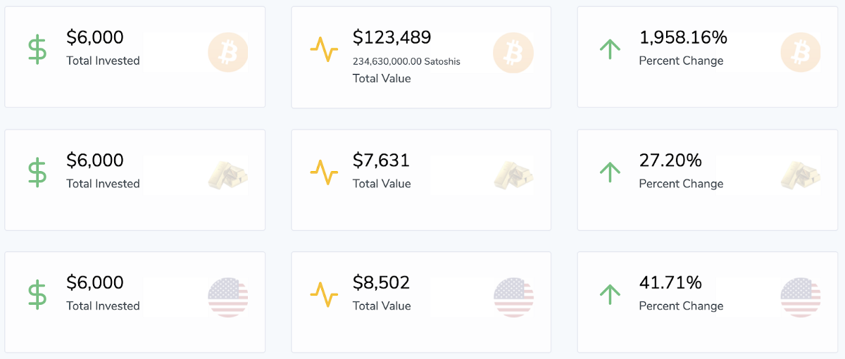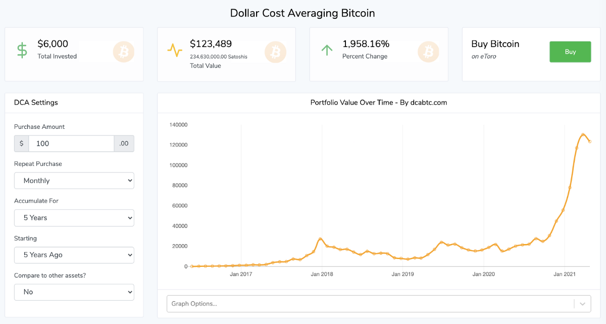 В качестве примера, инвестируя $100 ежемесячно на протяжении последних пяти лет, общая сумма инвестиций составила бы $6000, что по курсу на момент написания статьи соответствует приблизительно $125000. При этом доходность составила бы около 2000%, что в десятки раз выше чем у золота.