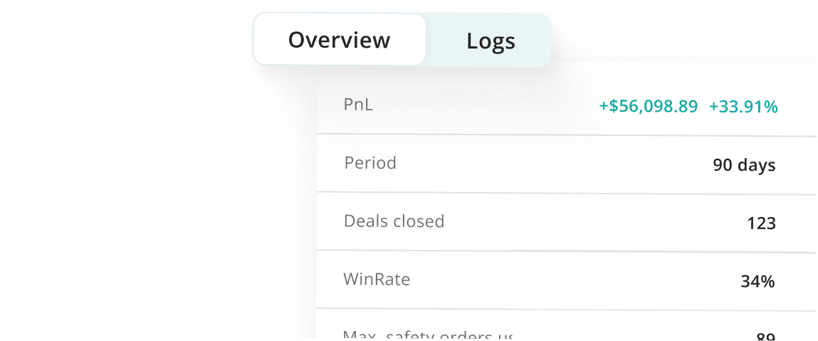 Full transparency: see every alert, decision, and execution step in detailed logs. Filter by bot, pair, or time and export for audits.