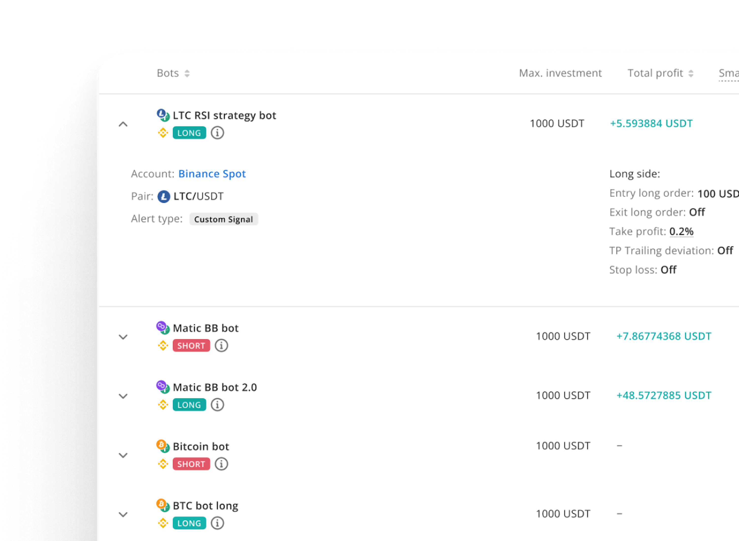 Run an entire TradingView strategy through 3Commas. See exactly which alerts triggered, which trades opened, and which didn’t — full visibility at every step.