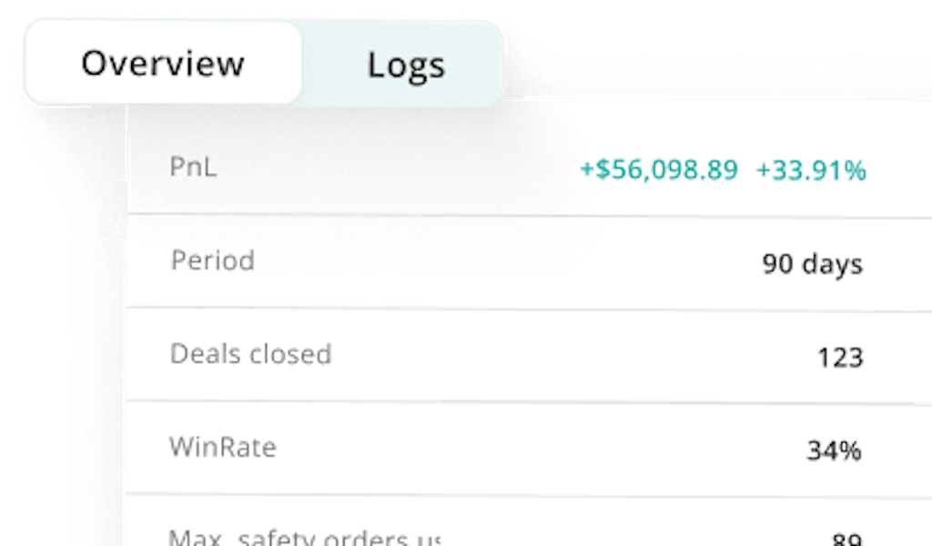 Full transparency: see every alert, decision, and execution step in detailed logs. Filter by bot, pair, or time and export for audits.